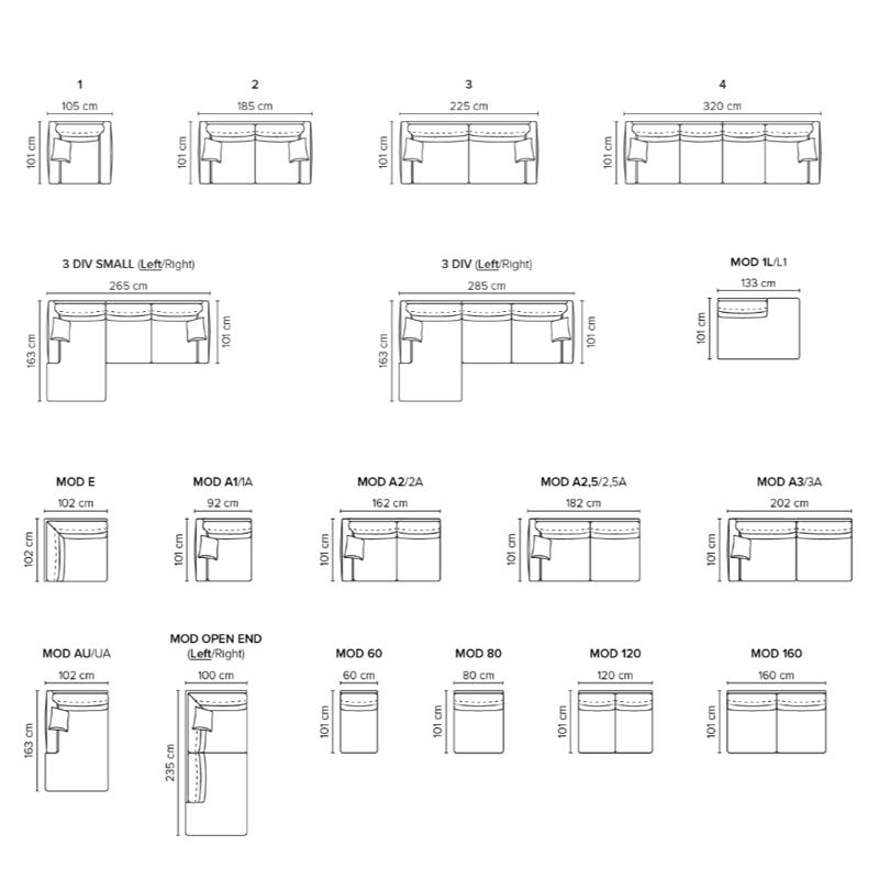 Er zijn legio opstellingen mogelijk. De mogelijke afmetingen ziet u op de laatste foto.